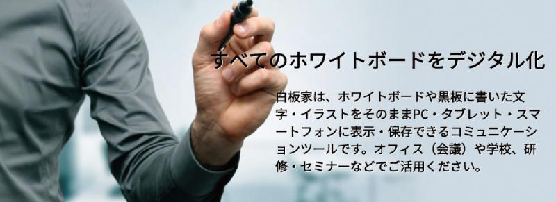 | 特徴 | 白板家はすべてのホワイトボードをデジタル化!! 白板家は、ホワイトボードや黒板に書いた文字・イラストをそのままPC・タブレット・スマートフォンに表示・保存できるコミュニケーションツールです。オフィス(会議)や学校、研修・セミナーなどでご活用ください。 |