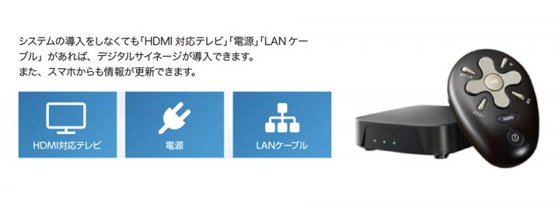 | 商品概要 | システムの導入をしなくても「HDMI 対応テレビ」「電源」「LAN ケーブル」があれば,デジタルサイネージが導入できます。また、スマホからも情報が更新できます。 |