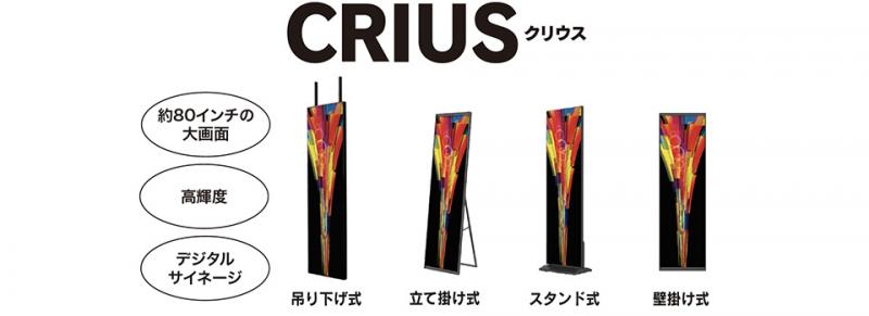 | 商品概要 | CRIUS(クリウス)は圧倒的な明るさの約80インチの大画面でコンテンツを流すことができる、自立式LEDポスターディスプレイです。 |