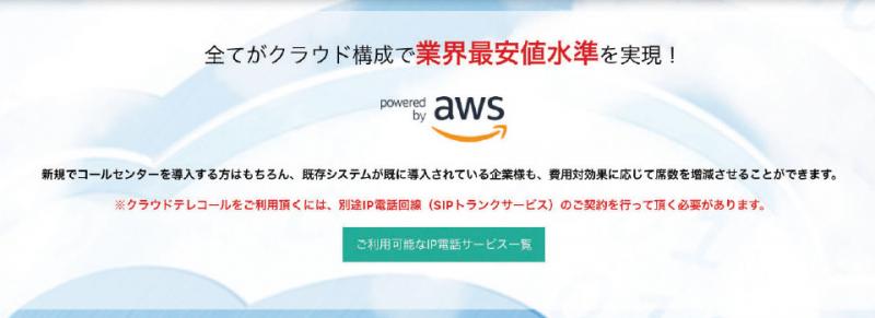 | 商品概要 | 全てがクラウド構成で業界最安値水準を実現! Powered by AWS 新規でコールセンターを導入する方はもちろん、既存システムが既に導入されている企業様も、費用対効果に応じて席数を増減させることができます。 ※クラウドテレコールをご利用頂くには、別途IP電話回線(SIPトランクサービス)のご契約を行って頂く必要があります。 |