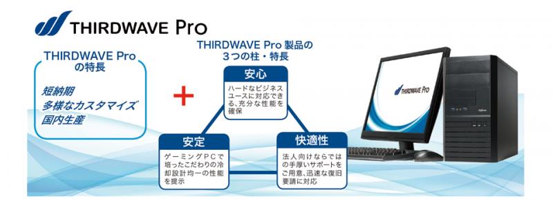 | 商品概要 | BTO パソコンメーカーとして、幅広いカスタマイズと短納期にて製品を提供しています。「THIRDWAVE Pro」は、デスクトップ PC、ノートPC、サーバー、ワークステーション等、各種法人向け製品を包括するブランド呼称です。 |