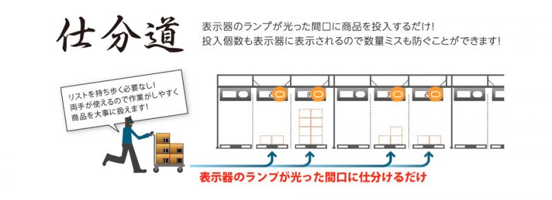 | 商品概要 | デジタルアソートシステム仕分道は物流センターの現場・倉庫にて行われる「仕分け作業」を誰でも・簡単・正確に行う ためのシステムです。 仕分けする棚に表示器を設置。表示器が点灯した棚にデジタル画面に表示される個数だけ商品を仕分けしていきます。 仕分けリストを確認しながらの仕分け作業に比べスピーディーに業務を行えます。 |