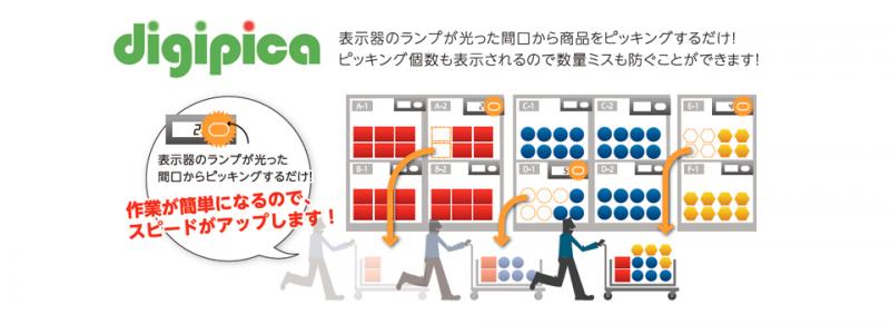 | 商品概要 | digipicaは倉庫・製造業などで行われるピッキング作業を誰でも・簡単・正確に行うためのシステムです。 ピッキングする棚に表示器を設置。表示器が点灯した棚の商品を、デジタル画面に表示される個数だけピッキングしていき ます。リストを確認しながらの作業に比べスピーディーに業務を行えます。 |