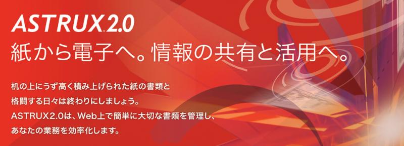 | 商品概要 | 「ASTRUX2.0」は、様々な文書を効率よく管理できる文書管理ツールです。企業における一般文書や契約書、ISO文書、機密文書、記録などの運用・管理・ワークフロー申請をWebベースで一元管理し、文書管理に関わる様々な業務を効率化。社内でのスピーディな意思伝達・決定を可能にし、セキュアなシステムで運用することで、お客様のビジネス発展をサポートします。 |