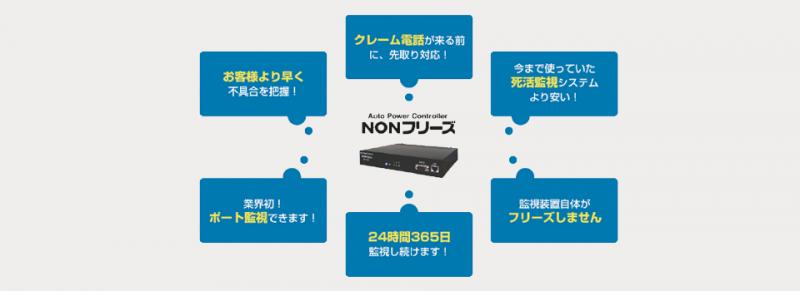| 商品概要 | NONフリーズは設定により、自動で全ての対象監視機器の不具合を感知し、自動リブートを行います。 人の手を介さず、またトラブル発生の連絡がくる前に監視対象機器の復旧が可能です。 さらに、NONフリーズはOSを搭載しておりません。(他社のPing監視機器はOSを搭載。)OSを搭載しないことで、NONフリーズ自体のフリーズを防いでいます。 |