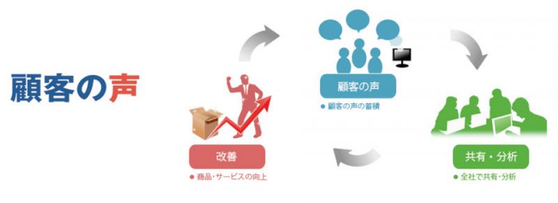| 機能 | ■顧客の声 顧客の声の蓄積 ■共有・分析 全社で共有・分析 ■改善 商品・サービスの向上 |