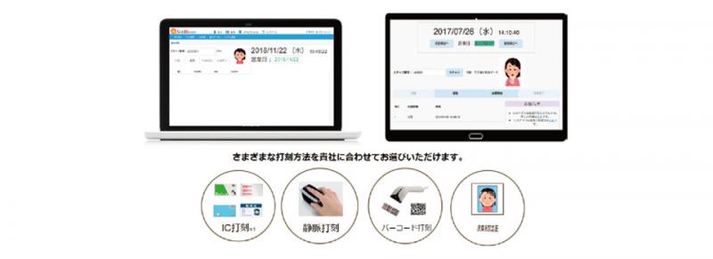 | 特徴 | PCだけで なく、タブレット打刻が可能であり、打刻方法はID入力の他『ICカード』『静脈打刻』『バーコード打刻』『顔認証』などの様々な打刻が可能です。 各拠点からの打刻データは、管理者画面にてリアルタイムに確認が可能です。 また、データの自 動集計機能もある為、集計作業の作業削減にも繋がります。 |