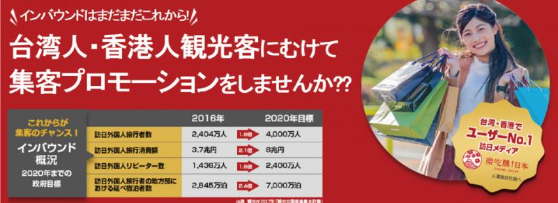 | 特徴 | Point1 ■台湾訪日外国人の4人に1人は台湾・香港人 Point2 ■総人口に対する顕在顧客が多い! 仮に10万人に情報をリーチした場合。 そのうち顕在顧客は、韓国:10,000人(10%)/中国:500人()、台湾+香港:20,000人です。 韓国(訪日客数)509万人/(人口)5,022万人 中国(訪日客数)637万人/(人口)135,700万人 台湾+香港(訪日客数)600万人/(人口)3,069万人 訪日する可能性の高い顕在顧客に効果的に周知できます。 Point3 ■訪日リピート率が高い! 8割以上がリピーターの台湾人、香港人観光客は、浅草教徒などの有名な観光地ではなくよりニッチな体験を求めています。 Point4 ■ネット利用率が高い! アジアの中でも高いネット普及率! インターネットでのプロモーションが集客の鍵になります。 |