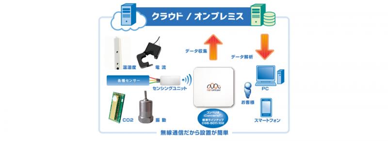 | 特徴 | ・設備監視 設備に取り付けたセンサー情報を簡易的に取得できます。 ・各種センサー情報 様々なアナログ・デジタル・シリアルセンサーに対応可能です。 ・簡単設置 ケーブルを這い回す必要性がありません。*RS-485を除く |