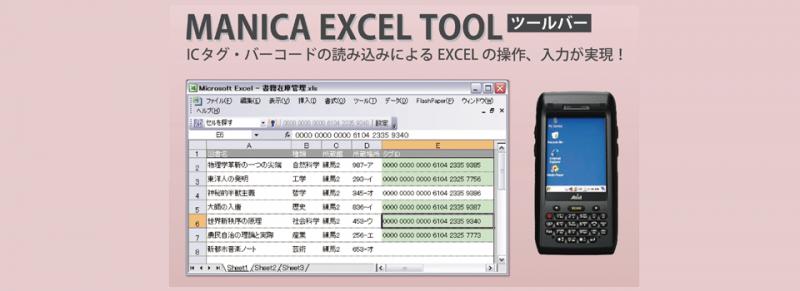 | 商品概要 | MANICA EXCEL TOOLは、お使いのエクセルで台帳がそのままRFIDシステムになるツールです。バーコードやICタグを利用した貸出と棚卸しを管理します。エクセルベースなので、カスタマイズも可能です。 |