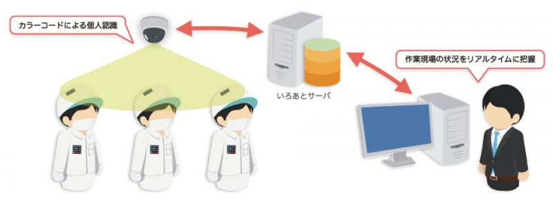 | 商品概要 | 「いろあと」とは、カラーコードとネットワークカメラを用いることにより、作業現場で働く作業者を個別認識し、 現場状況の見える化を行うソリューションです。 食品工場、製造工場、倉庫など、さまざまな現場の見える化、データ化、セキュリティ強化を実現します。 |